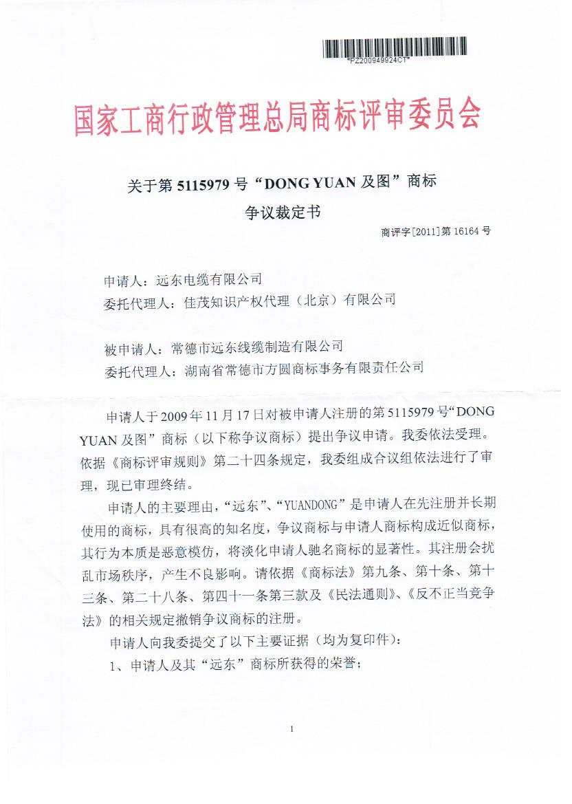 我司成功代理远东电缆有限公司对常德市远东线缆制造有限公司商标争议案件2011-9-2 17:08:44 |