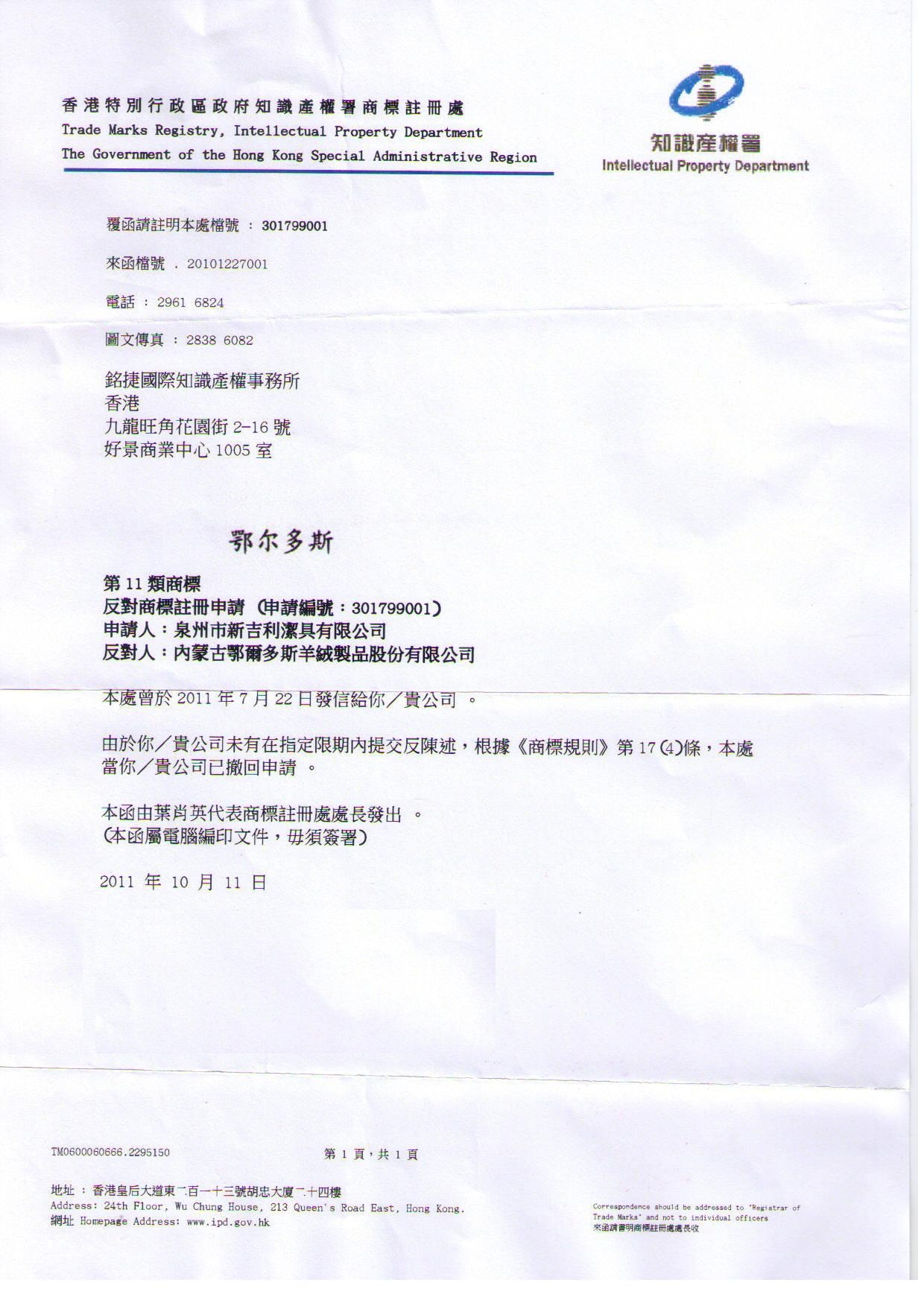 佳茂公司成功代理内蒙古鄂尔多斯羊绒制品有限公司在香港的反对2011-10-28 14:40:48 |