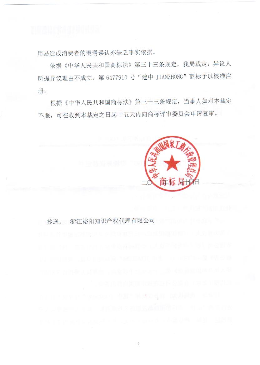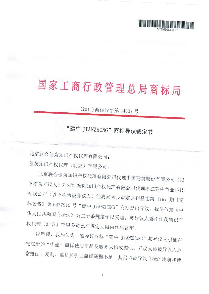 申请人浙江建中竹业科技有限公司依照法定程序在第5类“净化剂,冰箱除臭剂(去味剂),厕所除臭剂,非个人用除臭剂,空气清新剂,化学盥洗室用消毒剂,除霉化学制剂,空气净化制剂,漂白粉(消毒),衣服和纺织品用除臭剂”申请注册“建中 JIANZHONG”商标,商标局通过审理,并于2009年12月27日通过审查予以公告,公告号为6477910。 中国建筑股份有限公司于2010年3月16日向申请人的“建中 JIANZHONG”商标提起异议,异议理由: 佳茂公司接受申请人的委托,全面审查异议理由,根据《商标法》相关规定,针对性提起答辩事宜,商标局异议处接受了我司的观点。全面驳回中国建筑股份有限公司的异议申请,予2011年11月14日做出裁定,第6377910号“建中JIANZHONG”商标予以核准注册。