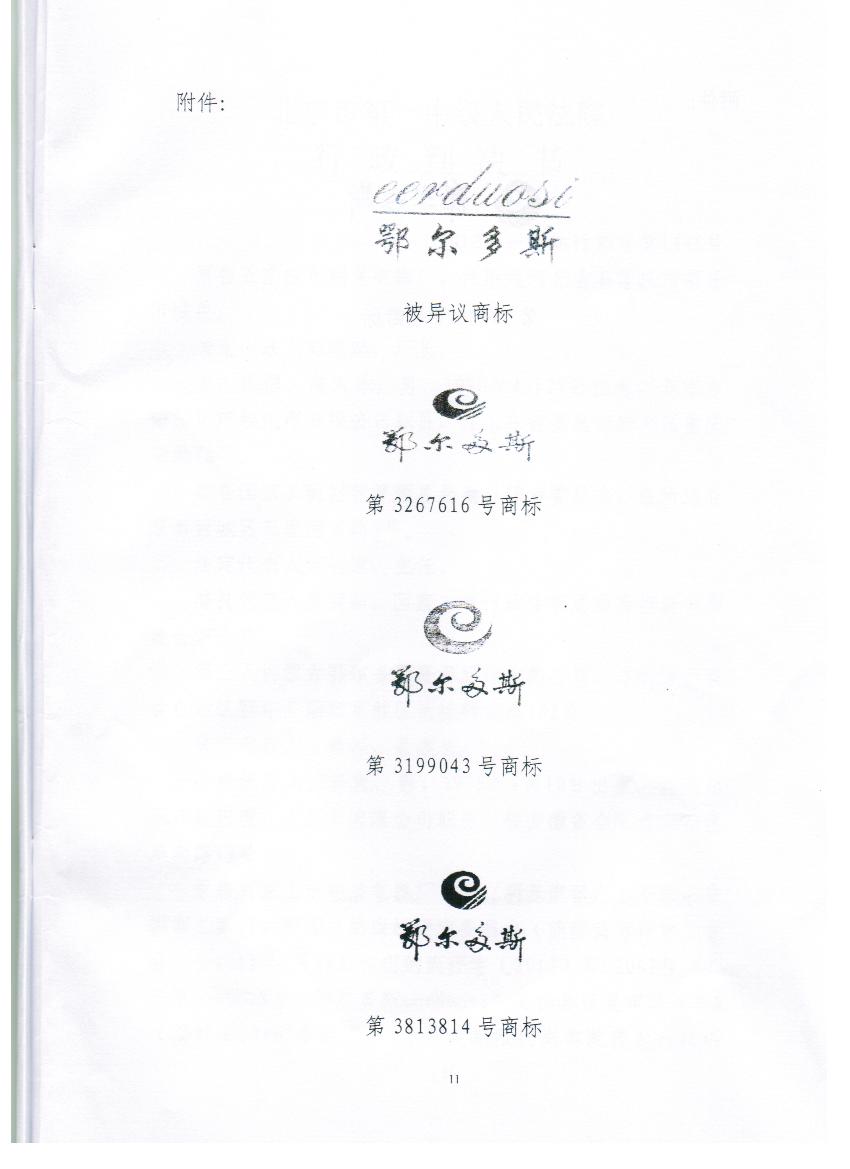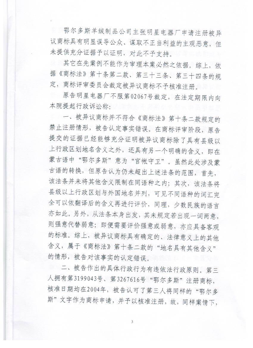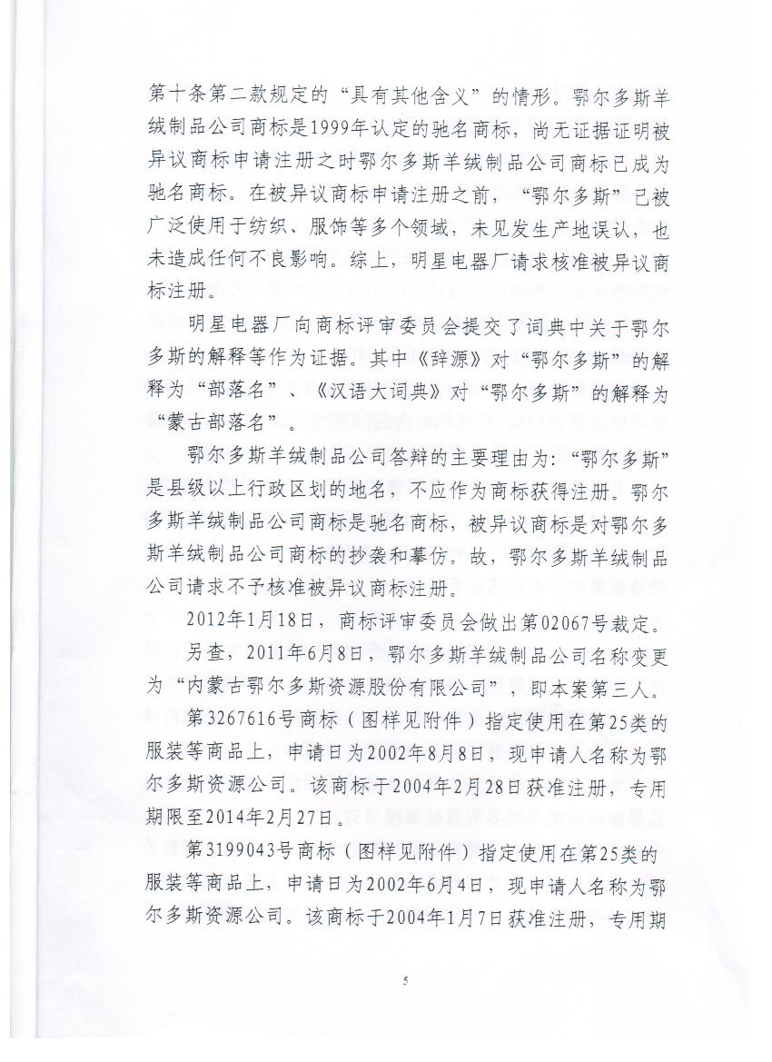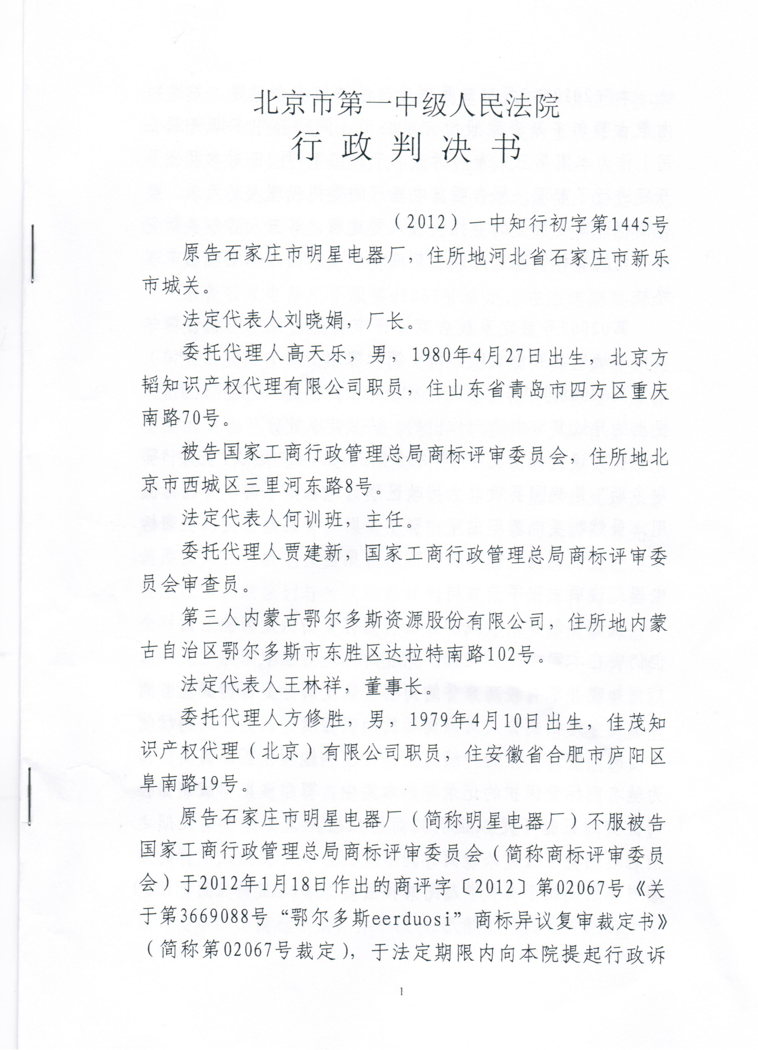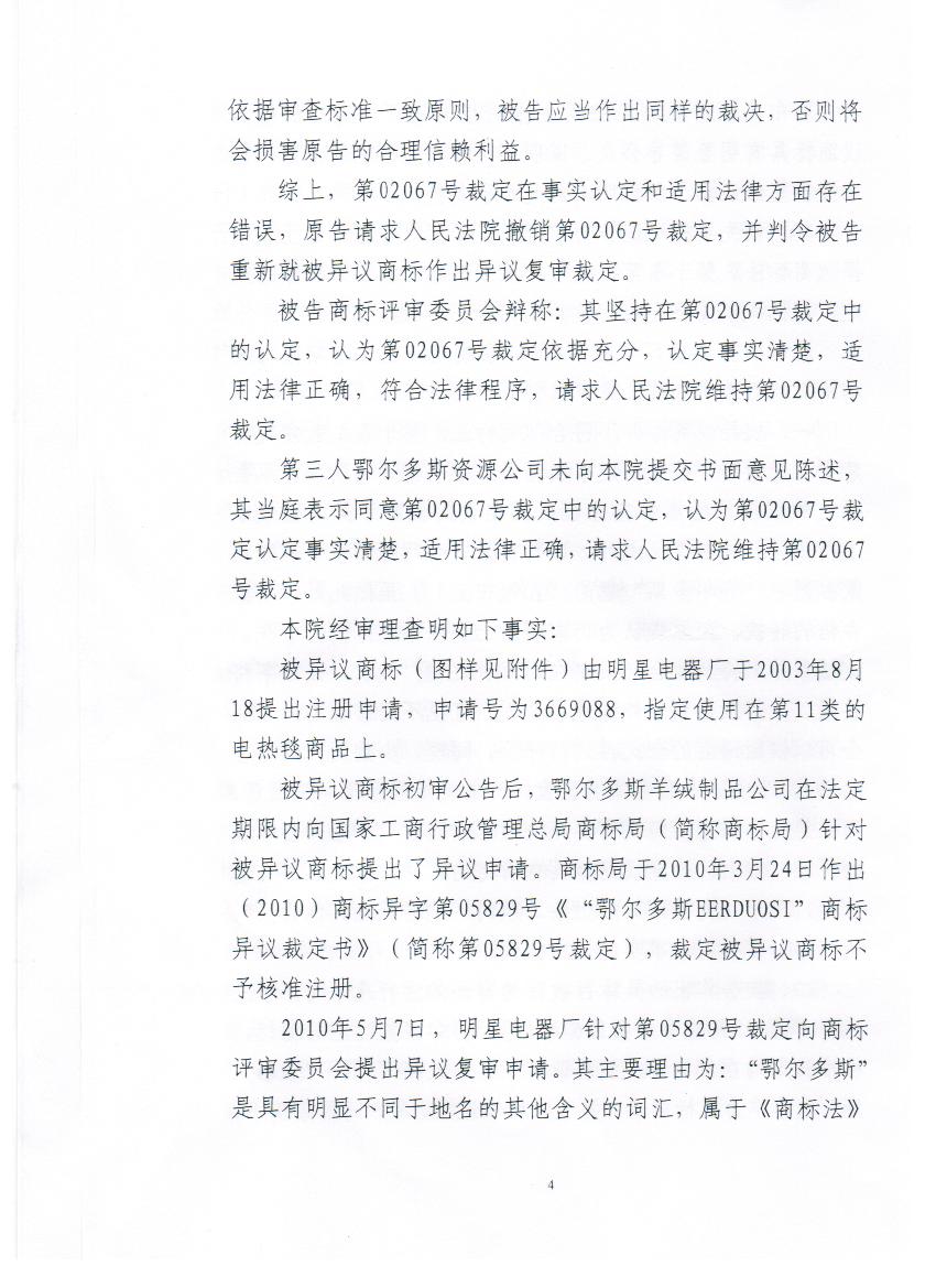2003年08月12日,石家庄市明星电器厂向商标局申请注册"鄂尔多斯EERDUOSI"商标,初审公告号为3669088,内蒙古鄂尔多斯资源股份有限公司(原内蒙古鄂尔多斯羊绒集团有限责任公司)对商标局提出异议,经过商标局审查,该商标予以撤销,但是石家庄市明星电器厂不服商标局的异议裁定,向商标评审委员会申请复审,该案件引起商标评审委员会的重视,在常委会议论,还是认同,"鄂尔多斯"县级以上的地名,决定商标局异议决定认定事实清楚,适用法律正确,该商标予以驳回. 石家庄市明星电器厂不服商标评审委员的决定,予法定期限内向北京市第一中级人民法院起诉,佳茂公司作为内蒙古鄂尔多斯资源股份有限公司代理人,参加庭审,全面阐述了事实理由,北京市第一中级人民法院予2012年6月19日正式判决,3669088号"鄂尔多斯EERDUOSI"予以撤销。 对此,对内蒙古鄂尔多斯资源股份有限公司维护品牌的决心表示支持。