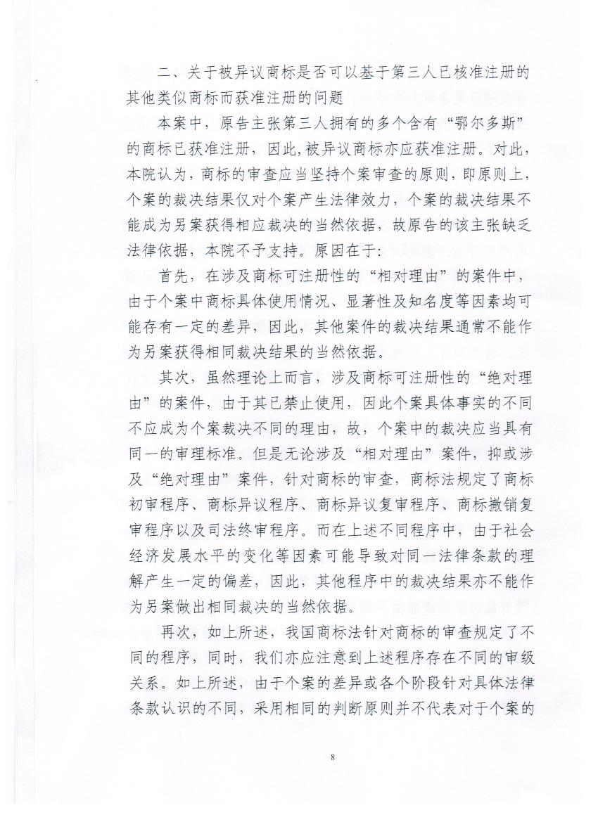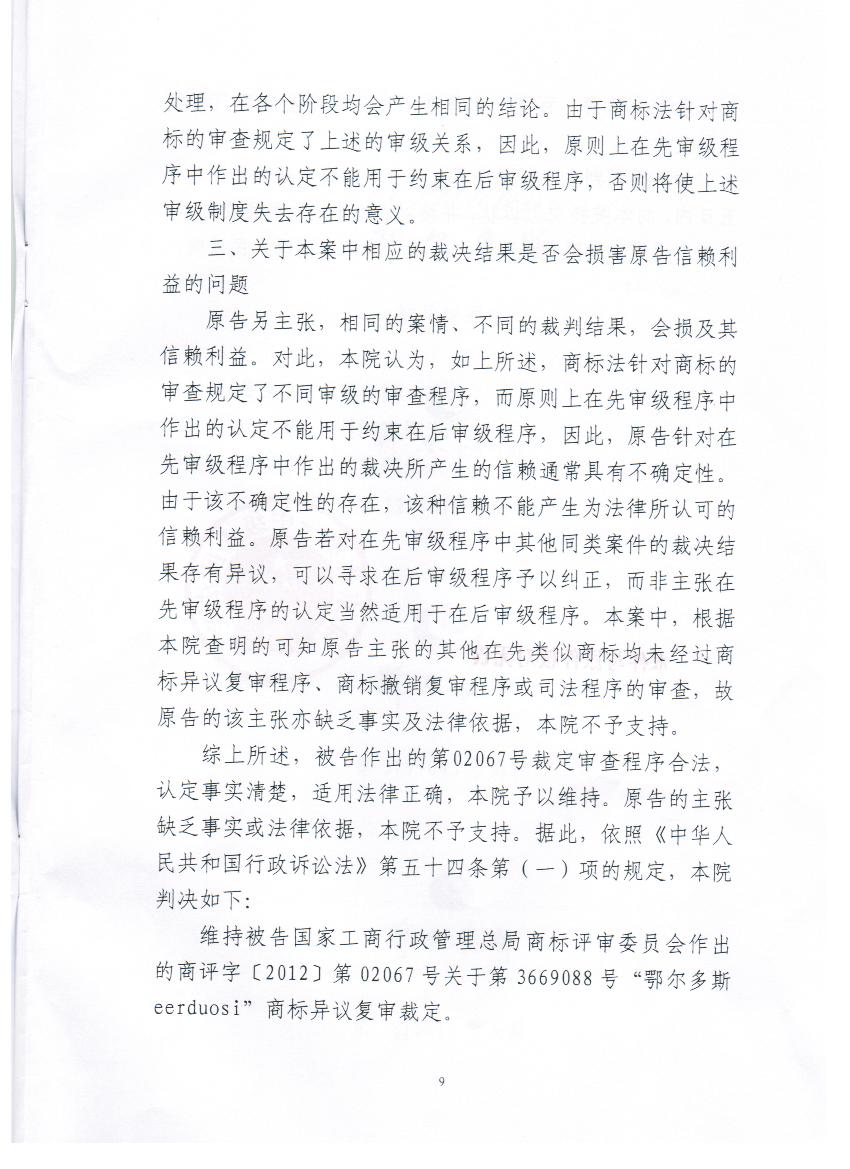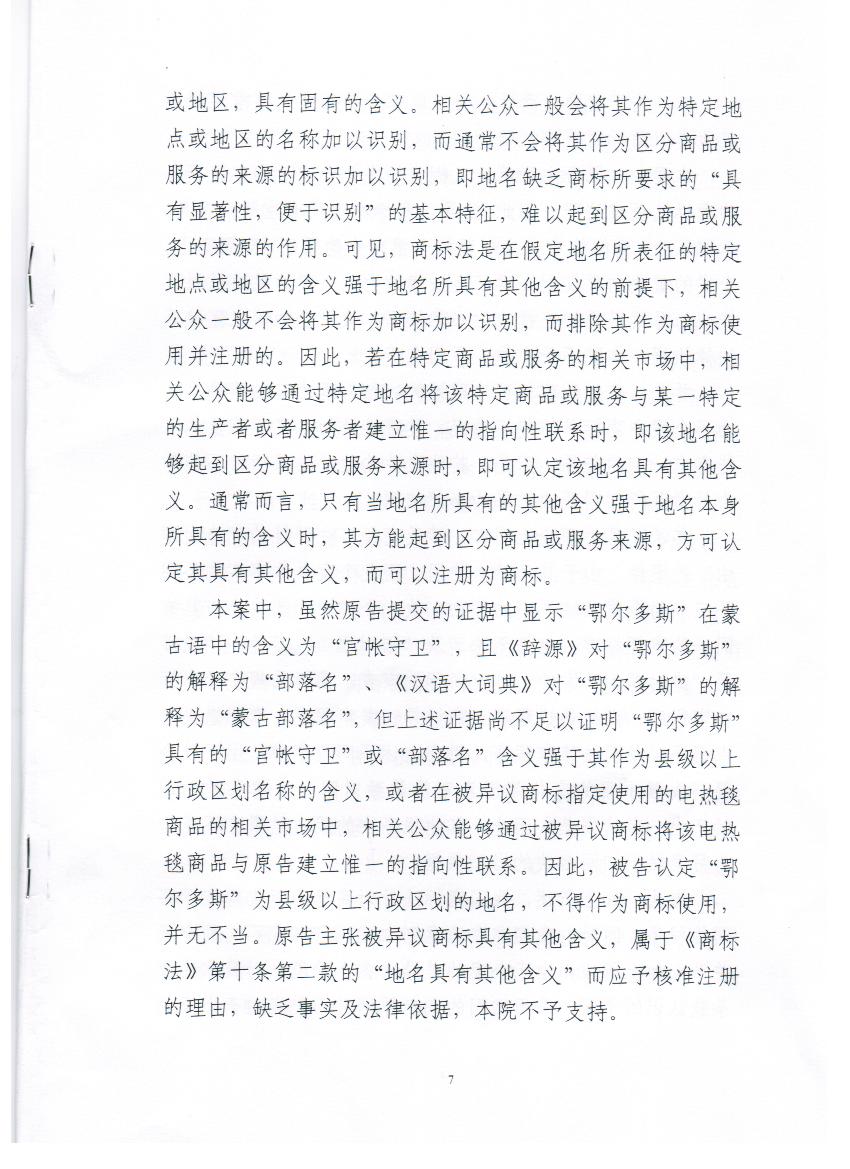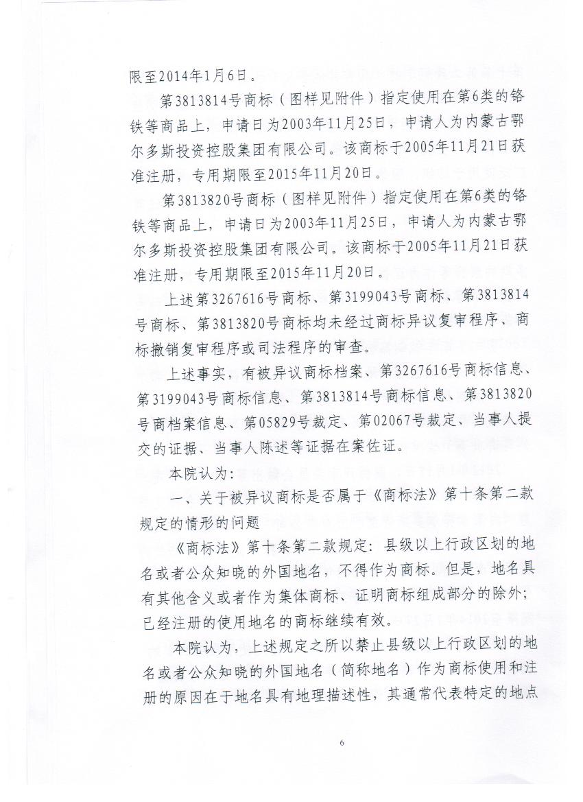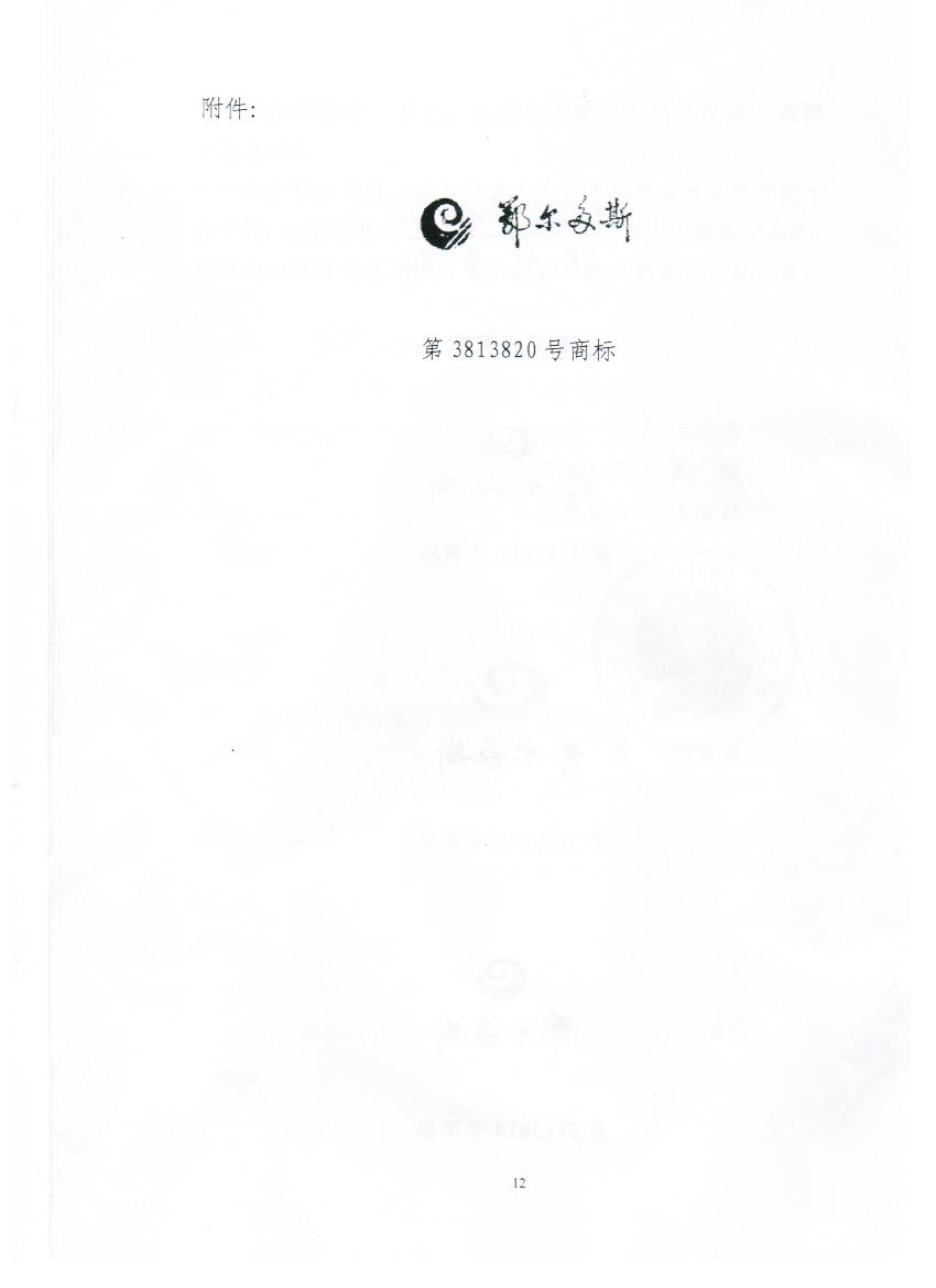 2003年08月12日,石家庄市明星电器厂向商标局申请注册"鄂尔多斯EERDUOSI"商标,初审公告号为3669088,内蒙古鄂尔多斯资源股份有限公司(原内蒙古鄂尔多斯羊绒集团有限责任公司)对商标局提出异议,经过商标局审查,该商标予以撤销,但是石家庄市明星电器厂不服商标局的异议裁定,向商标评审委员会申请复审,该案件引起商标评审委员会的重视,在常委会议论,还是认同,"鄂尔多斯"县级以上的地名,决定商标局异议决定认定事实清楚,适用法律正确,该商标予以驳回. 石家庄市明星电器厂不服商标评审委员的决定,予法定期限内向北京市第一中级人民法院起诉,佳茂公司作为内蒙古鄂尔多斯资源股份有限公司代理人,参加庭审,全面阐述了事实理由,北京市第一中级人民法院予2012年6月19日正式判决,3669088号"鄂尔多斯EERDUOSI"予以撤销。 对此,对内蒙古鄂尔多斯资源股份有限公司维护品牌的决心表示支持。