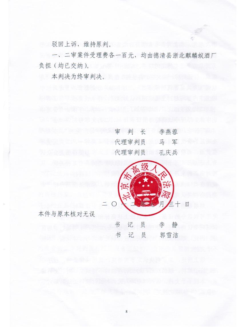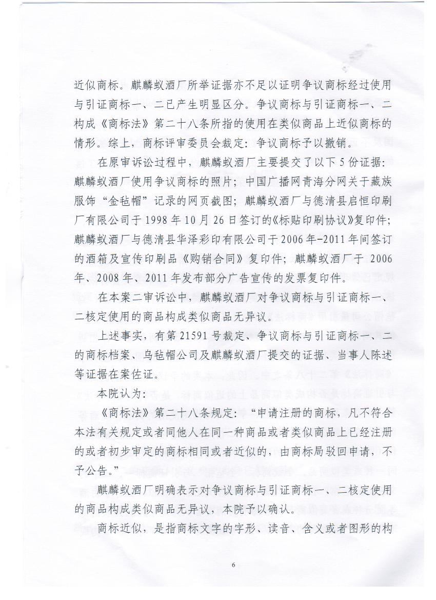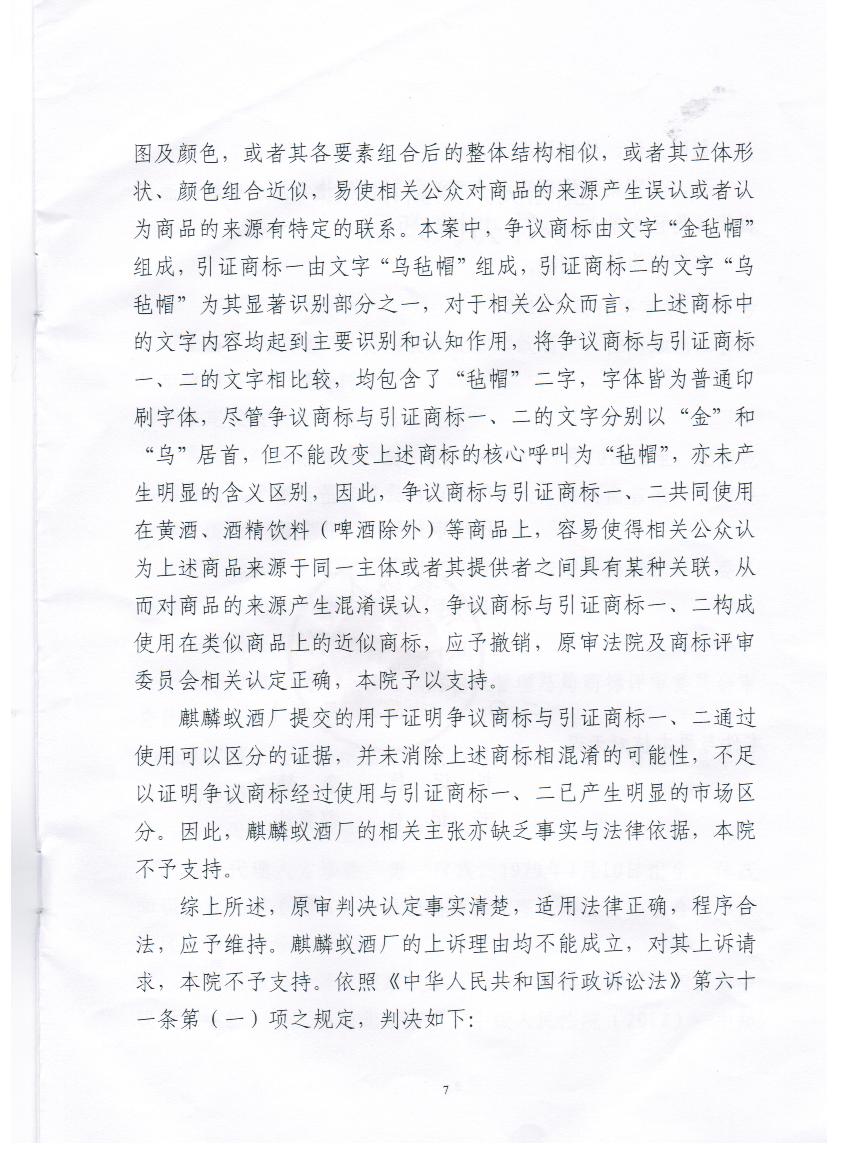 德清县浙北麒麟蚁酒厂不服北京市第一中级人民法院的判决,向北京市高级人民法院提起上诉,佳茂公司作为第三人的代理人参考诉讼,在法院上,佳茂公司充分维护了第三人的利益,阐述了“金毡帽”与“乌毡帽”是近似商标。 北京市高级人民法院2012年7月30日判决如下:原审判决认定事定清楚,适用法律正确,程序合同,应予以维持,德清县浙北麒麟蚁酒厂上诉理由均不能成立,对其上诉请求,本院不予支持。